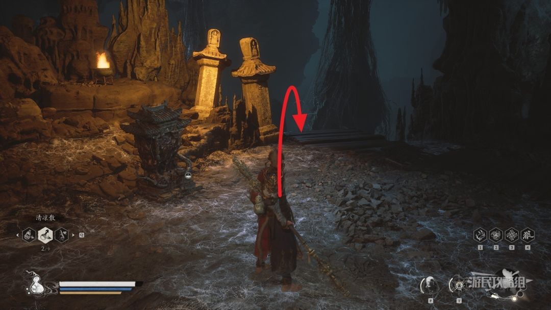 从第四回【盘丝洞-中层】土地庙出发,跳下土地庙旁边的木板。