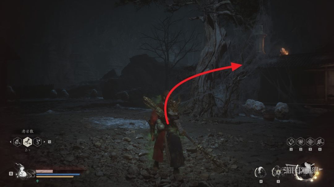 到达树附近之后,参考下图,树右侧有个房子,房子和后面石头之间有一条楼梯,走楼梯往上。