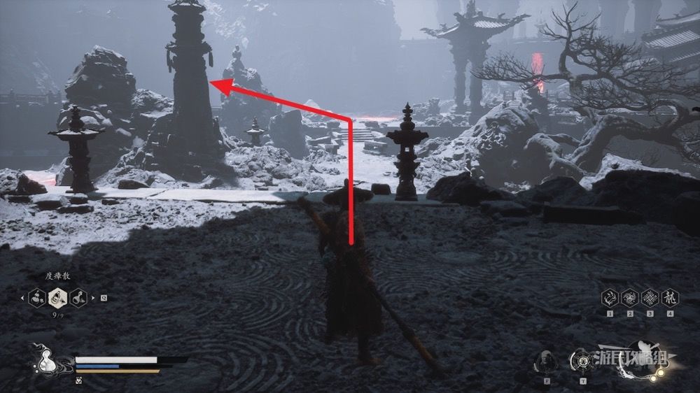从第五回【丹灶谷-罗刹宫】土地庙出发,沿着石桥和走廊一直往前走。