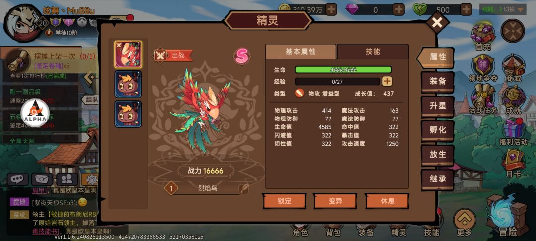接下来就是精灵了,精灵这个东西我真是有点无语了,我大号到现在都没开出来火鸟,我专门为了写攻略建的小号,首冲都没充一发入魂直接火鸟,服了,我们精灵如果有很多a级的情况下记得选适合自己的,经验下面那里有写物攻和魔攻的区别,战士物攻法师魔攻,如果有一只s级就无脑上就可以了