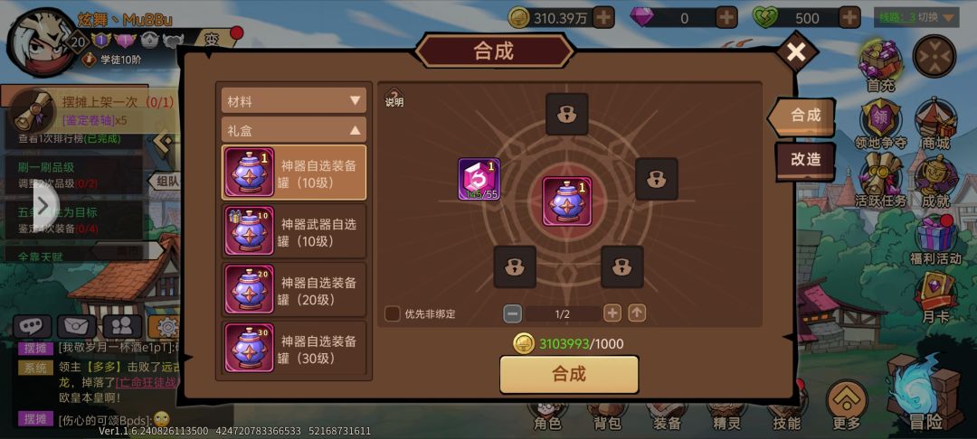 如果你感觉推图乏力打不动怪了,可以回主城,把能领的奖励全部领完,然后打开改造所,左边礼盒页面,先给自己换一套十级的粉装穿(如果不够换一套可以换武器和首饰),因为十级的后面不用的话还可以分解获得强化石,性价比是高的,换完装备就可以开始打造了。