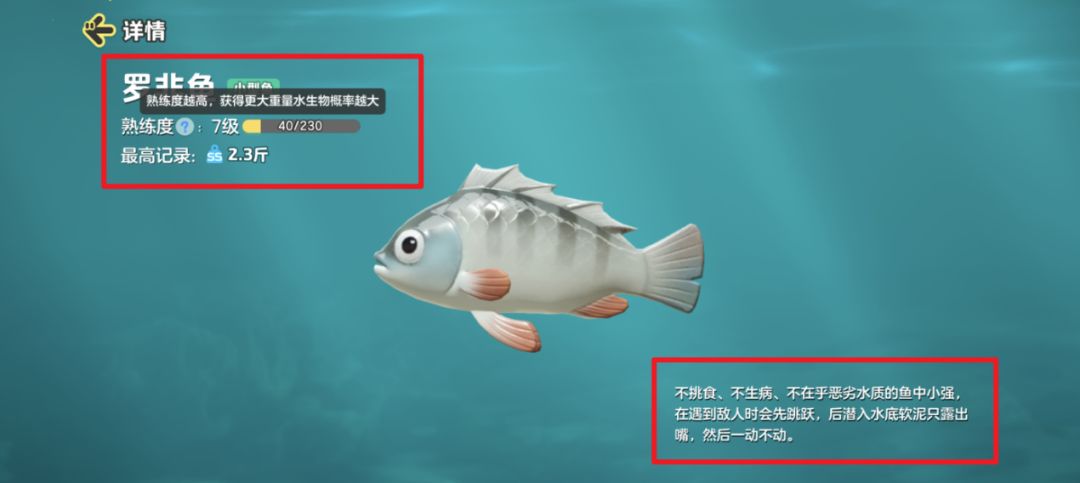 而稀有度级别为稀有、奇珍、金冠稀世的水生物,熟练度越高,除了提升出现概率以外,之后钓起更重水生物的概率也会越高。也就是说,对应水生物的熟练度刷得越高,钓起大鱼的概率和重量都会越高。