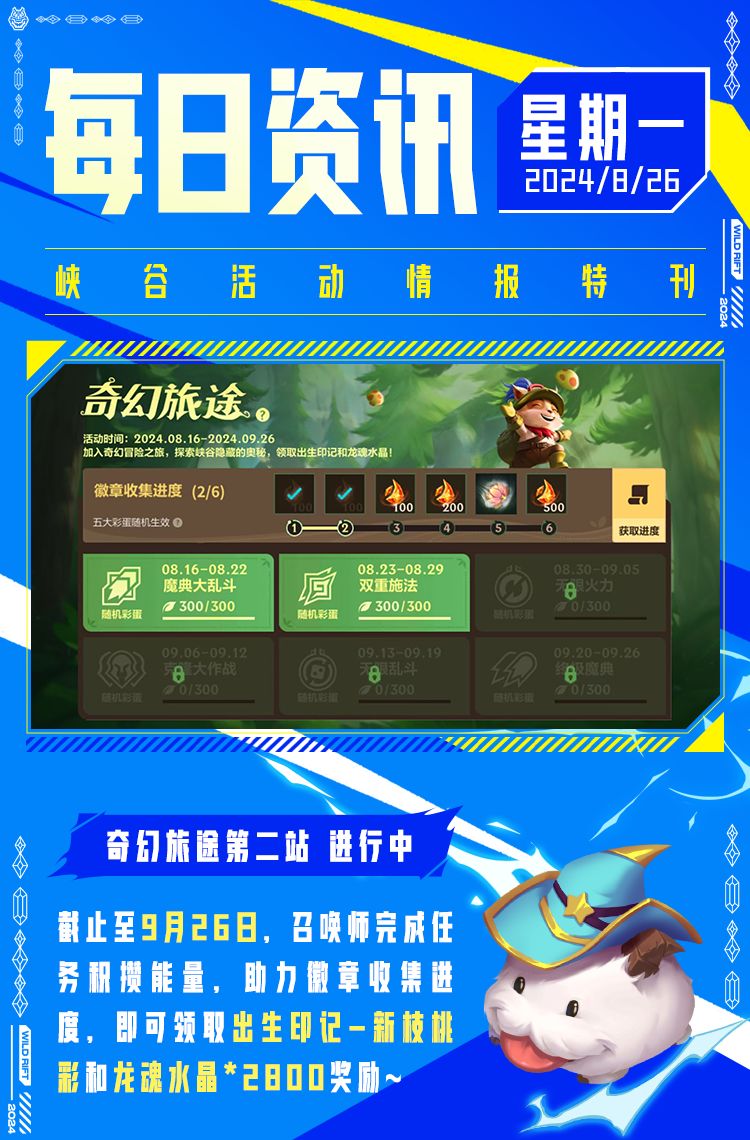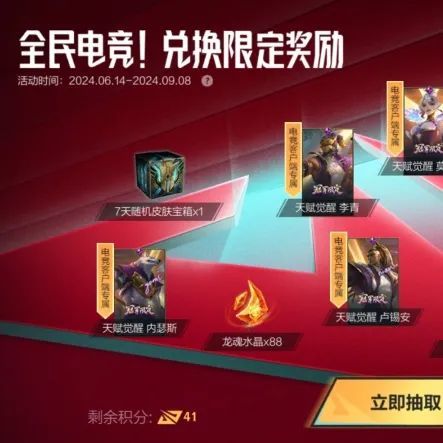 奖励:天赋觉醒系列皮肤,玉剑传说 苍鸾 莫甘娜,神龙守卫 加里奥,全英雄畅玩卡,7天随机皮肤宝箱,双倍晶石卡,龙魂水晶*88