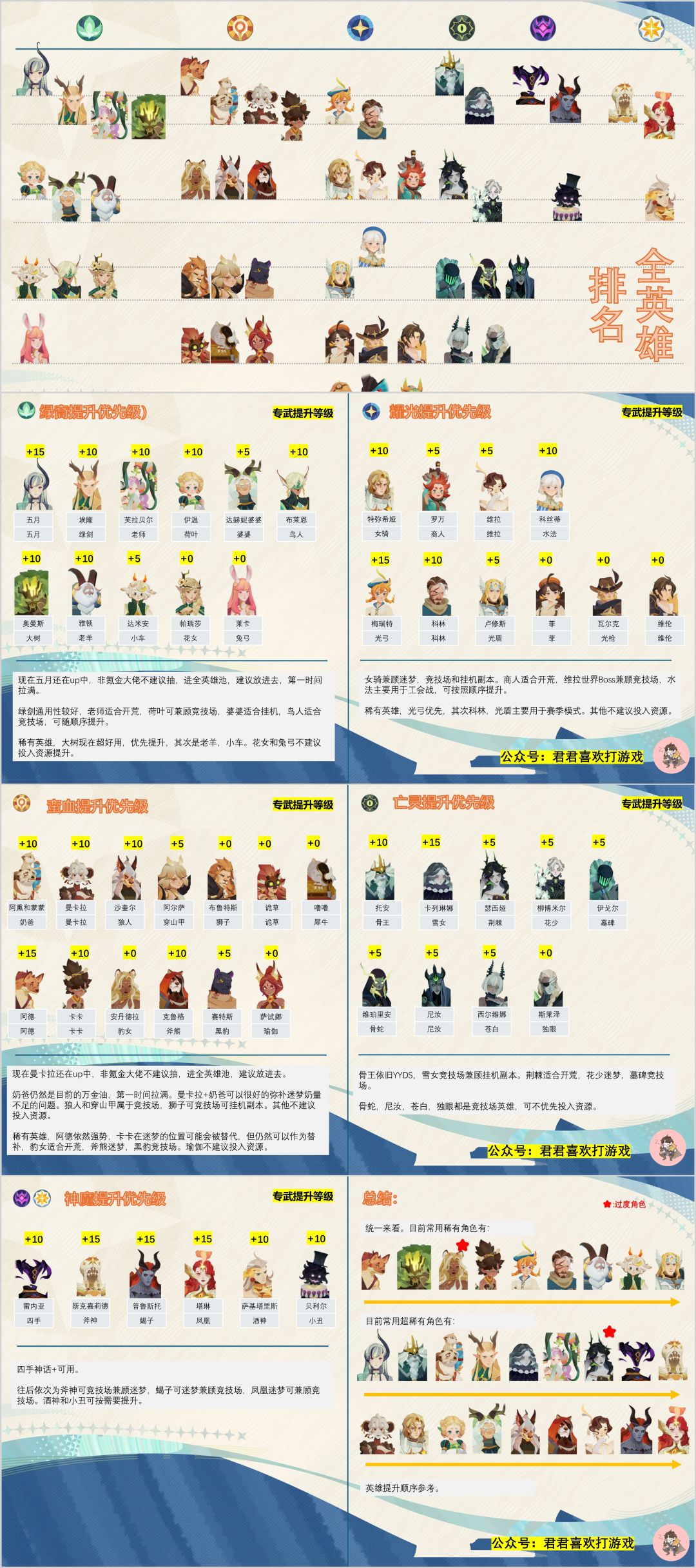 主要内容有英雄排名,英雄名称,专武提升以及英雄提升优先级。