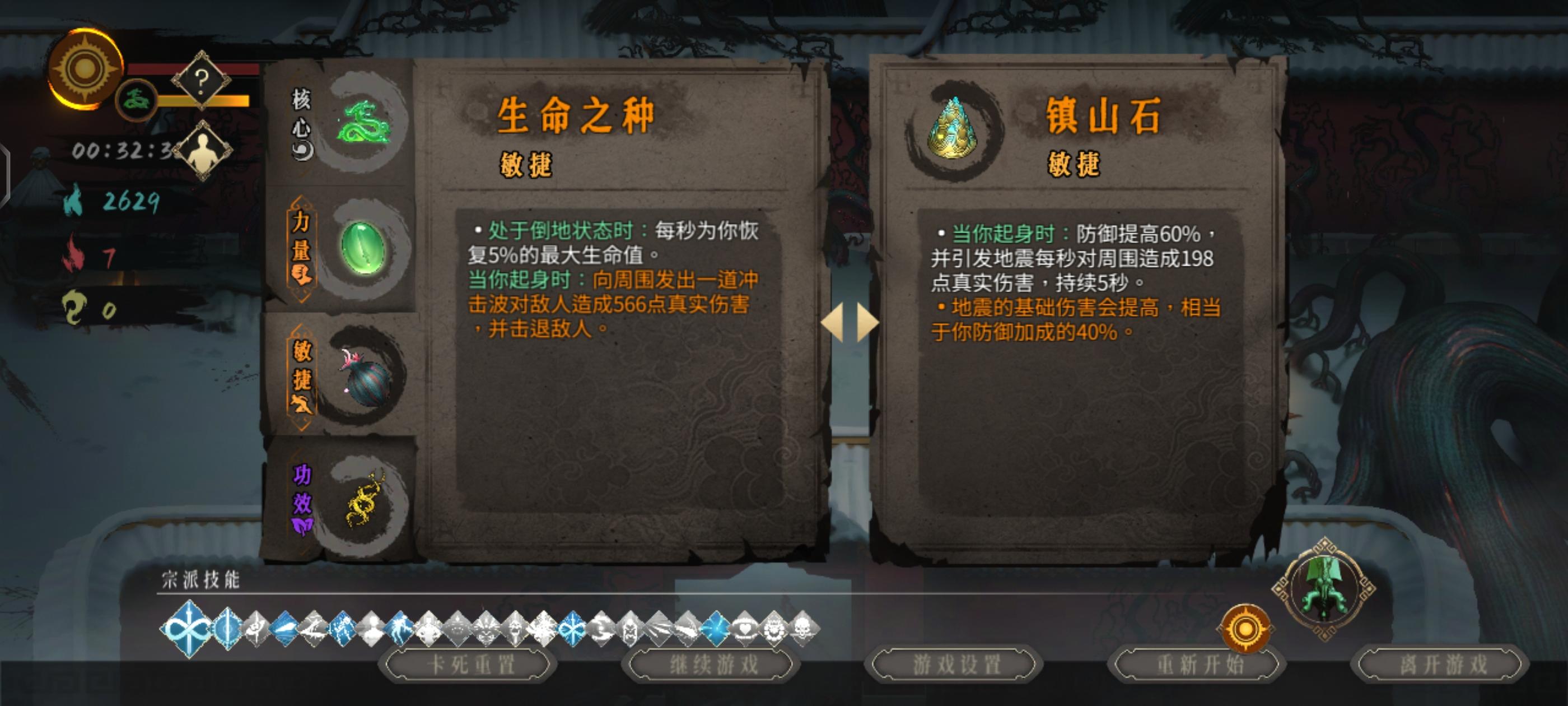 下面的圣物又让我幸运得刷到了生命之种和镇山石。没血了?不要怕,直接挨一下然后躺,躺着回血。躺着还能自动打怪。配合天赋小憩和走火入魔不要太爽。加强小憩,弥补走火入魔劣势。