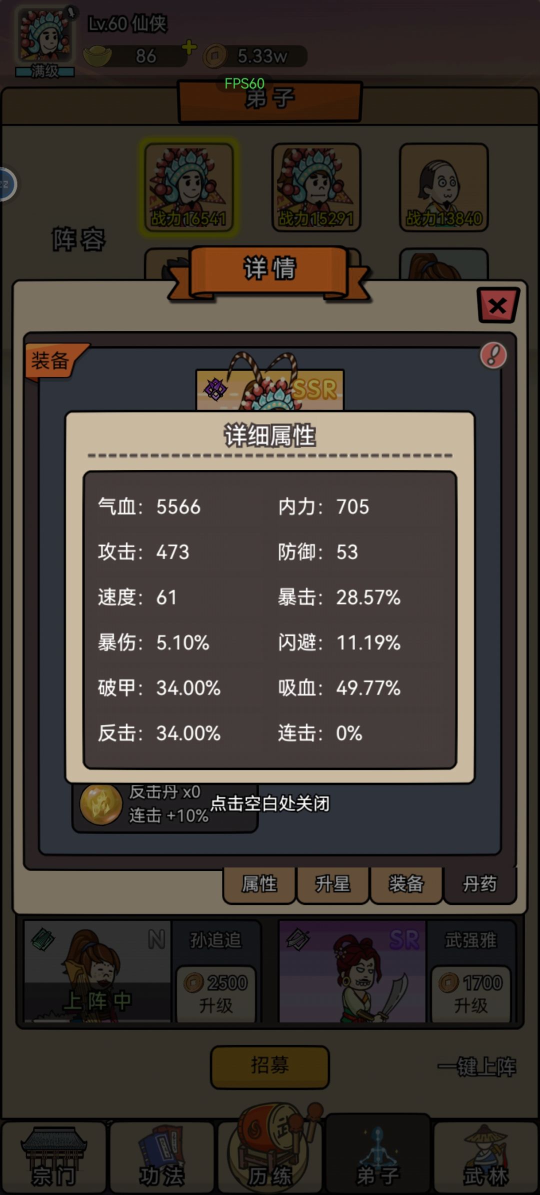 三是丹药有bug,连击和反击搞混了。然后吃了4个吸血丹,每个加10%,34的三星的刺客,每次加3.4,理论该是34+3.4X4=47.6,结果是49.77。