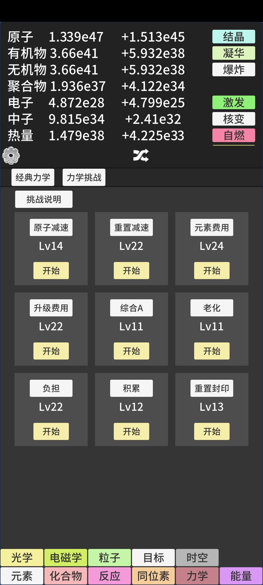 开通粒子后各挑战能做到的级别。电磁和光学应该还能提。但已经花了4天。累了。