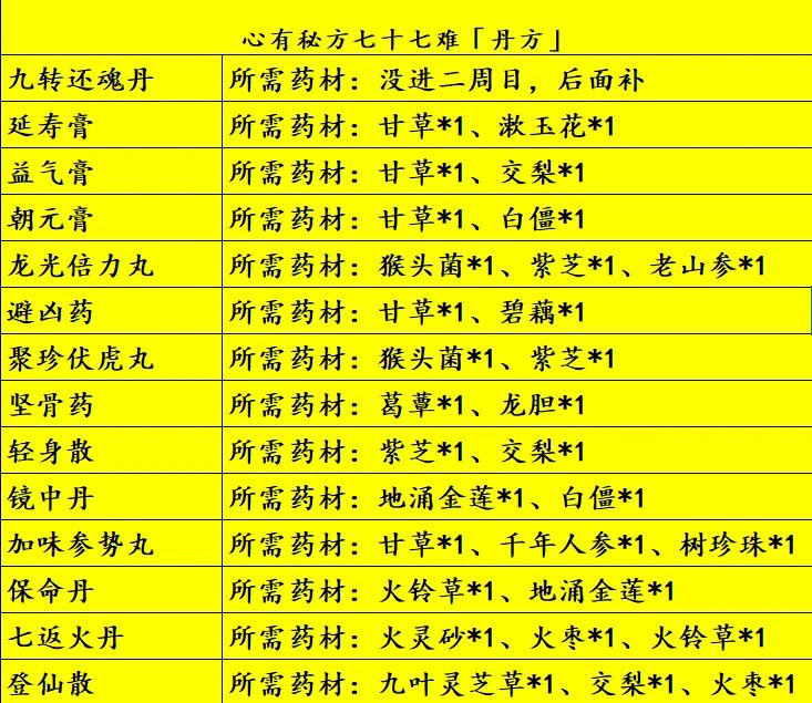 这里是天龙筮,这期我们来讲心有秘方七十七难「丹方全收集」