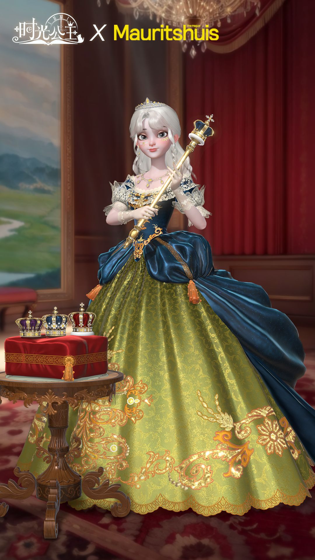 本套服饰以Mauritshuis,The Hague 中的油画展品——《玛丽亚的午憩》为原型,原画作为奥地利公主玛丽亚·特蕾莎的肖像画,其服饰华丽繁复,西式廓形裙与《时光公主》经典的服饰设计风格相契合。另外,更为奇妙的是,原展品中的主人公玛丽亚·特蕾莎还是《时光公主》首本故事书中玛丽王后的母亲。