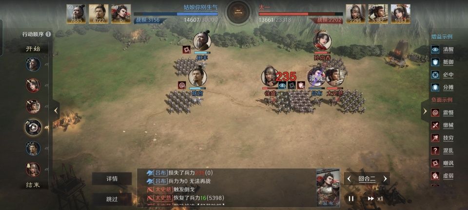 在此特别鸣谢给本文提供创作素材的玩家朋友,他在游戏里的ID名为“太一”。通过他分享的战报,我们见识到了徐太香的漂亮联动。即便是面对田丰、陈宫和吕布的黑科技白门骑,徐太香依旧能够在兵力处于劣势的情况下完成逆转。战斗才进行到第二回合,对面的吕布就遭到了击溃,到底是如何做到的,且看下文分解!