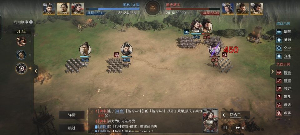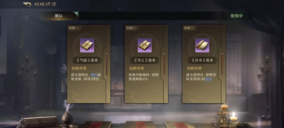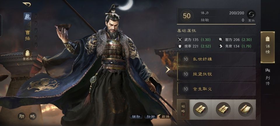 曹操战法:乱世奸雄+披坚执锐+舍生取义。韬略库:气临善本+守土善本+兵令善本。重盾兵特性不屈,专精点亮屹然不动。如此设定的曹操在前排还兼顾了嘲讽、治疗和连击率的提升,披坚执锐精准投放到了他自己和武力最高的吕布身上,吕布还能从他那里获得清醒。