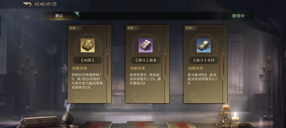 陈宫战法:智令从计+无难之志+百战不殆。韬略库:论武(专属)+先勇善本+兵情善本。长弓兵特性洞悉,专精点亮远攻近守。单单是从陈宫这里,吕布就额外获得了55%的连击率提升,加上曹操那里还有30%,总共提升了85%的连击率。在百战不殆的加持下,吕布的武力值理论最多可以叠加56点,这把菜刀真是被磨到了极致。