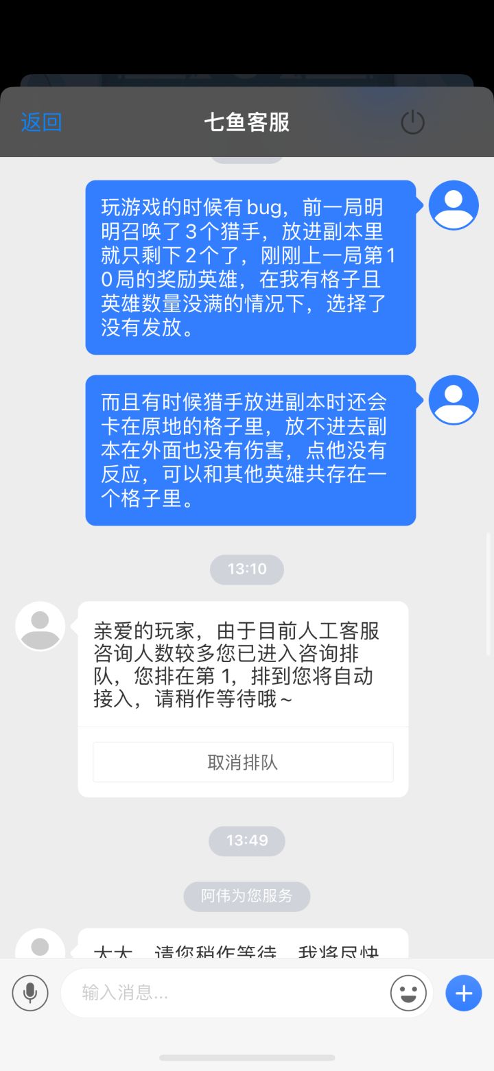 首先,关于人工客服问题:我13.10是排队第一人,等轮到我的时候已经13.49了。人工客服处理一位玩家的时间要40分钟,人工客服你到底在处理什么问题需要这么久?能不能多找几位人工客服,并且每位人工客服能多线操作?