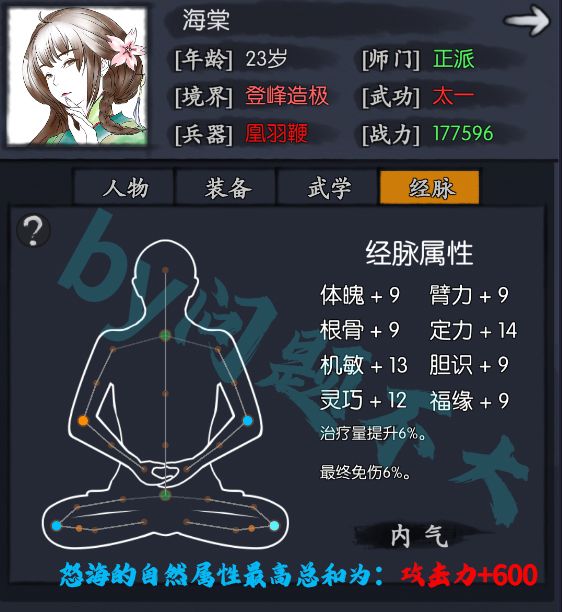 这一套应该是攻击最高的了吧,加上专属装备以及内功,淬炼比较佛,没材料淬满,如果全升满攻击有1w2以上了(海棠的第二武学的1号小技能药王神典-阴补,就是按海棠自己攻击力的26%来算,所以这边选的是全叠攻击,如果有别的恶心流也可以分享下,虽然海棠可能有些大佬已经不在pvp内使用了),同时如果解锁了内功的,药王经也是按自身攻击力给友方减免一定伤害量的