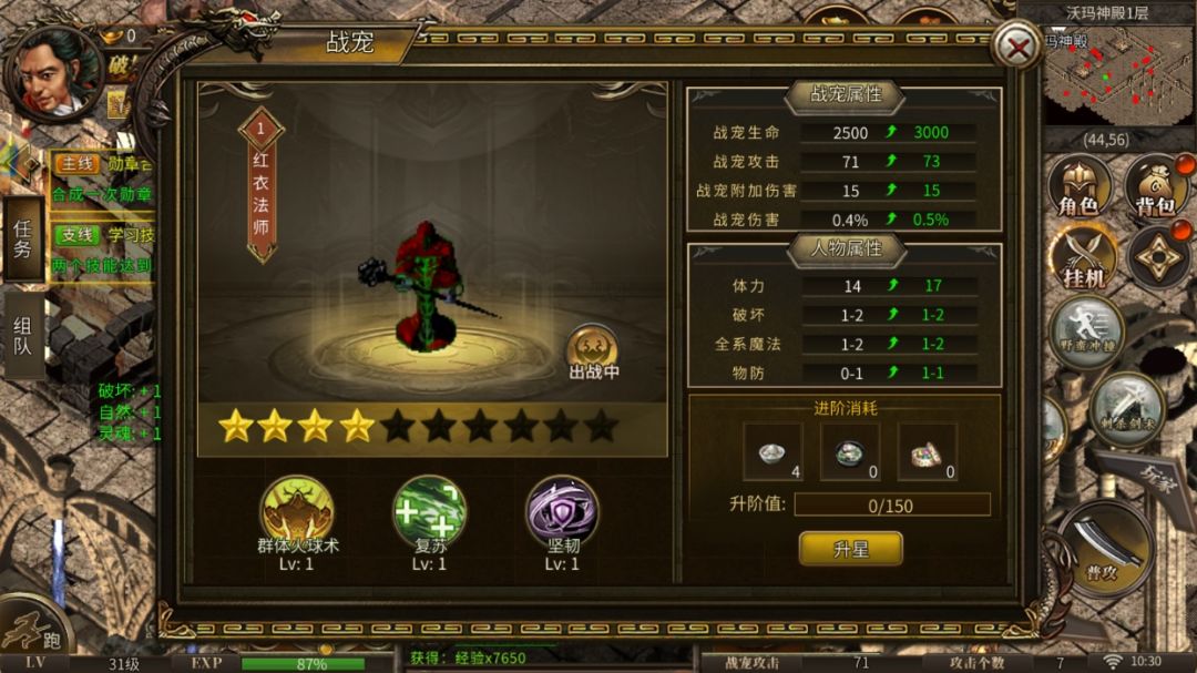 角色创建与职业选择战士:擅长近战,拥有高生命值和强大的近战能力。核心技能包括十方斩(范围攻击)、破血狂杀(高伤害爆发)、莲月剑法等。推荐修炼神圣、风、火元素,因为前期这些元素弱点的怪物较多,可提高打怪效率。属性方面主加破坏。