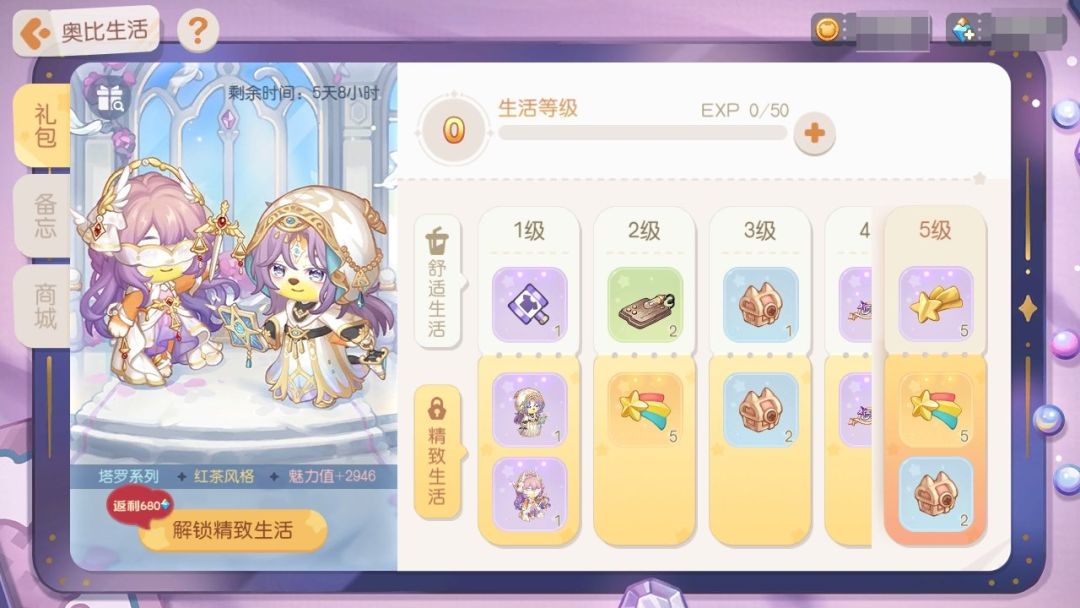 豪华生活活动周期内,升级解锁豪华生活礼包,除享有精致生活礼包相同权益外,还立即赠送礼包等级20级、专属头像框「正义明心」、「萌二驾到」收集季自选典藏卡盒、300晶钻福利,享有每日备忘经验20%加成。(若已购买精致礼包,升级豪华礼包时赠送礼包等级为10级)
