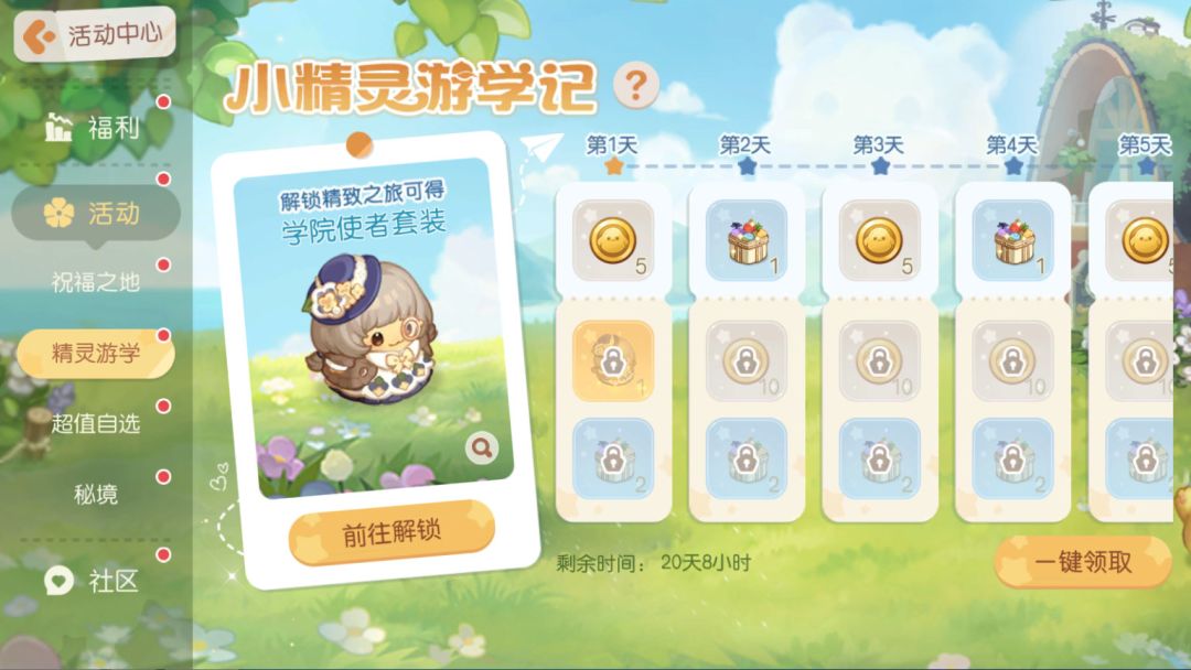 活动时间:8月29日5:00-9月18日23:59新活动小精灵游学记限时开启!活动期间内,奥比们通过每日登录即可领取「精灵硬币」「精灵果自选礼盒」奖励;购买解锁精致之旅,可获得小精灵限定装扮「学院使者套装」和「晶钻」奖励,喜欢的小奥比快快行动吧!
