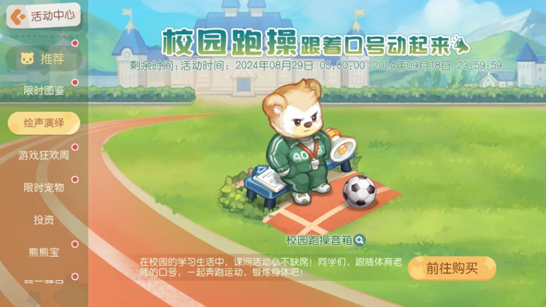 宠物「美梦貘」限时上线,全新道具「校园跑操音箱」上线,跟着体育老师的口号奔跑起来吧。全新三人互动坐垫「熊熊快乐操」上线,快叫朋友们一起来跳操吧!