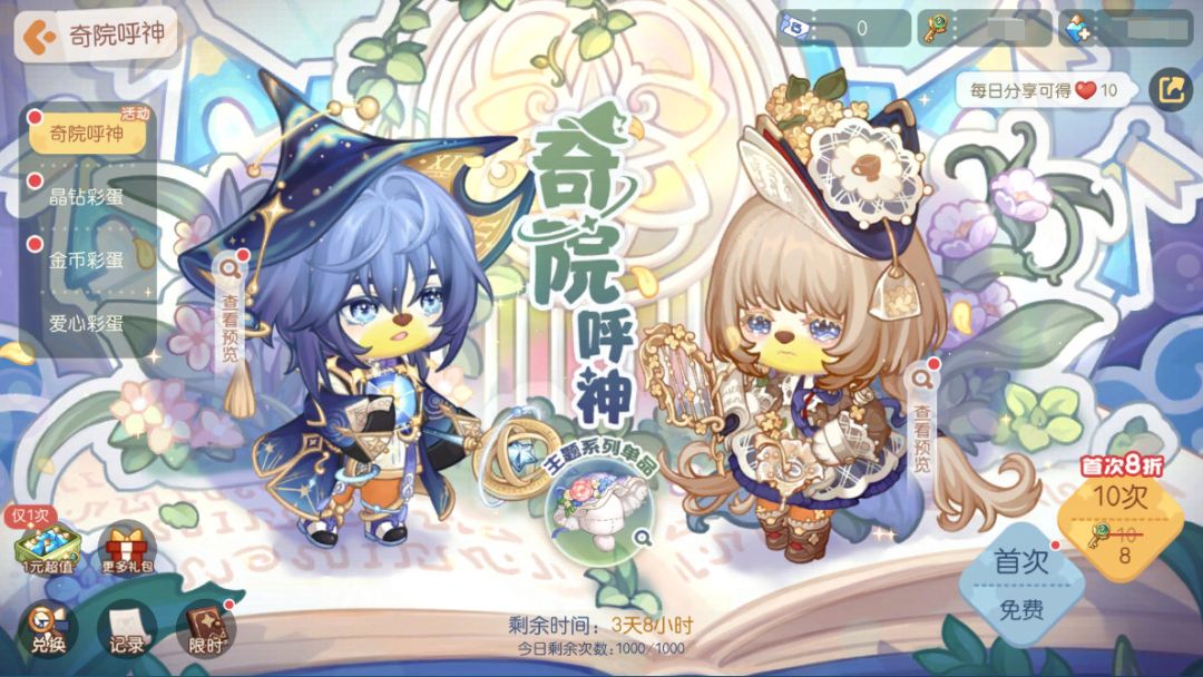 活动时间:8月29日5:00-9月18日23:59学院主题彩蛋“奇院呼神”限时登场!彩蛋上新送福利!新彩蛋开启后可免费抽取一次,首次使用时空之钥和晶钻抽取10连还可分别享受首次8折优惠!彩蛋奖动包含晨星品质时装「理学院套装」、「文学院套装」以及晨星品质家具套装「奇妙学院」系列等全新礼物!还有典藏品质的「动漫社学长套装」、「动漫社学妹套装」 、「穿梭时光」装扮散件和「奥比漫展」家具散件等奖励限时获取哦!