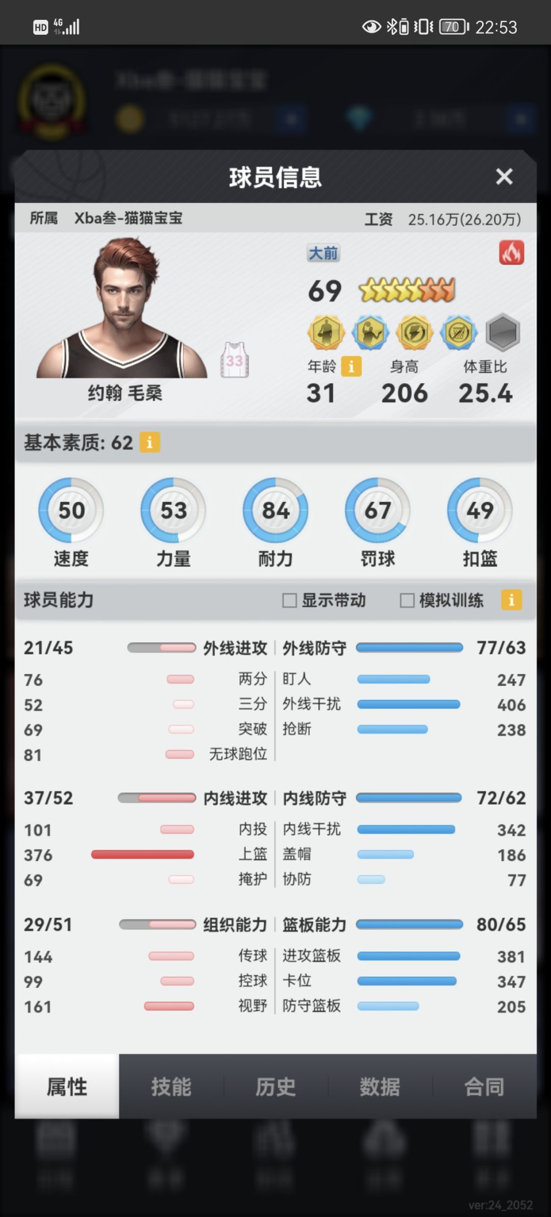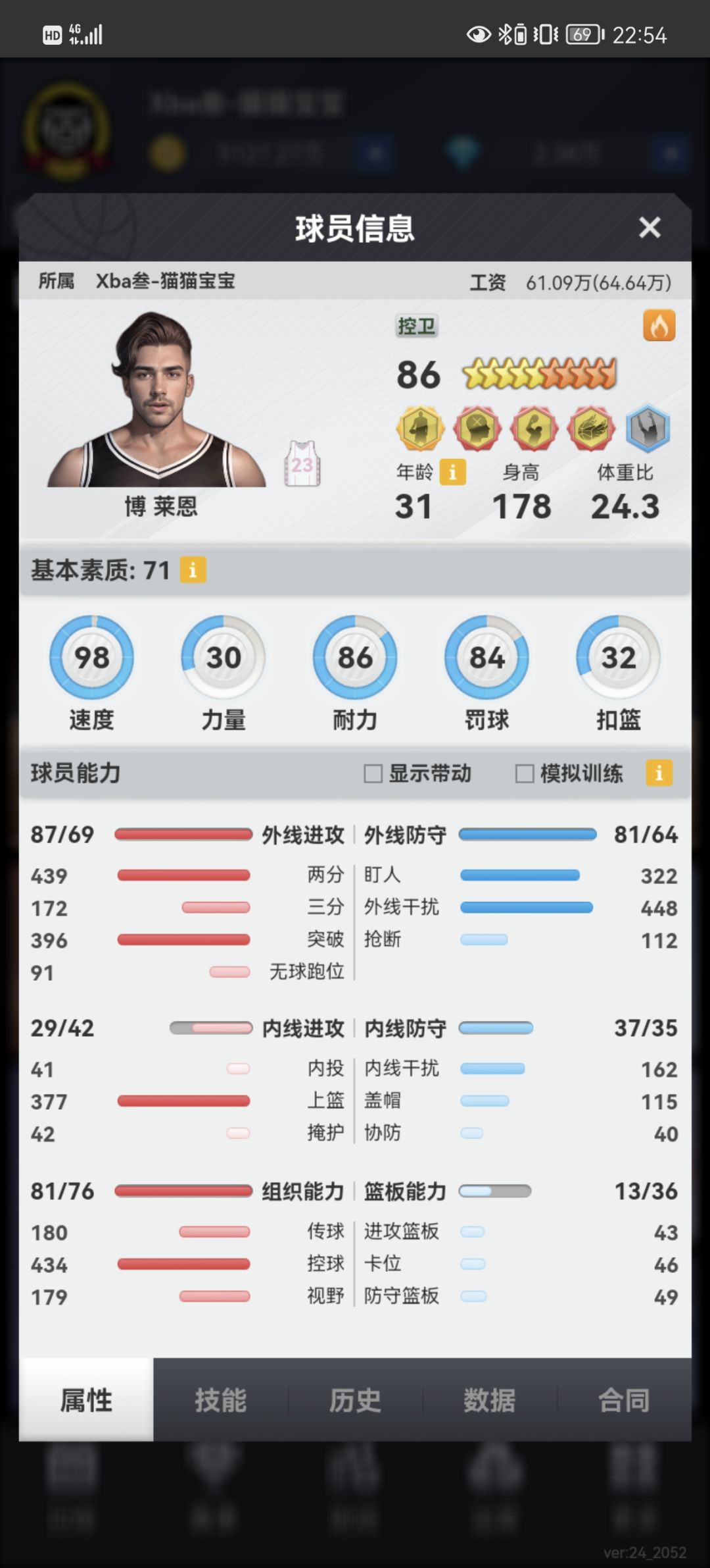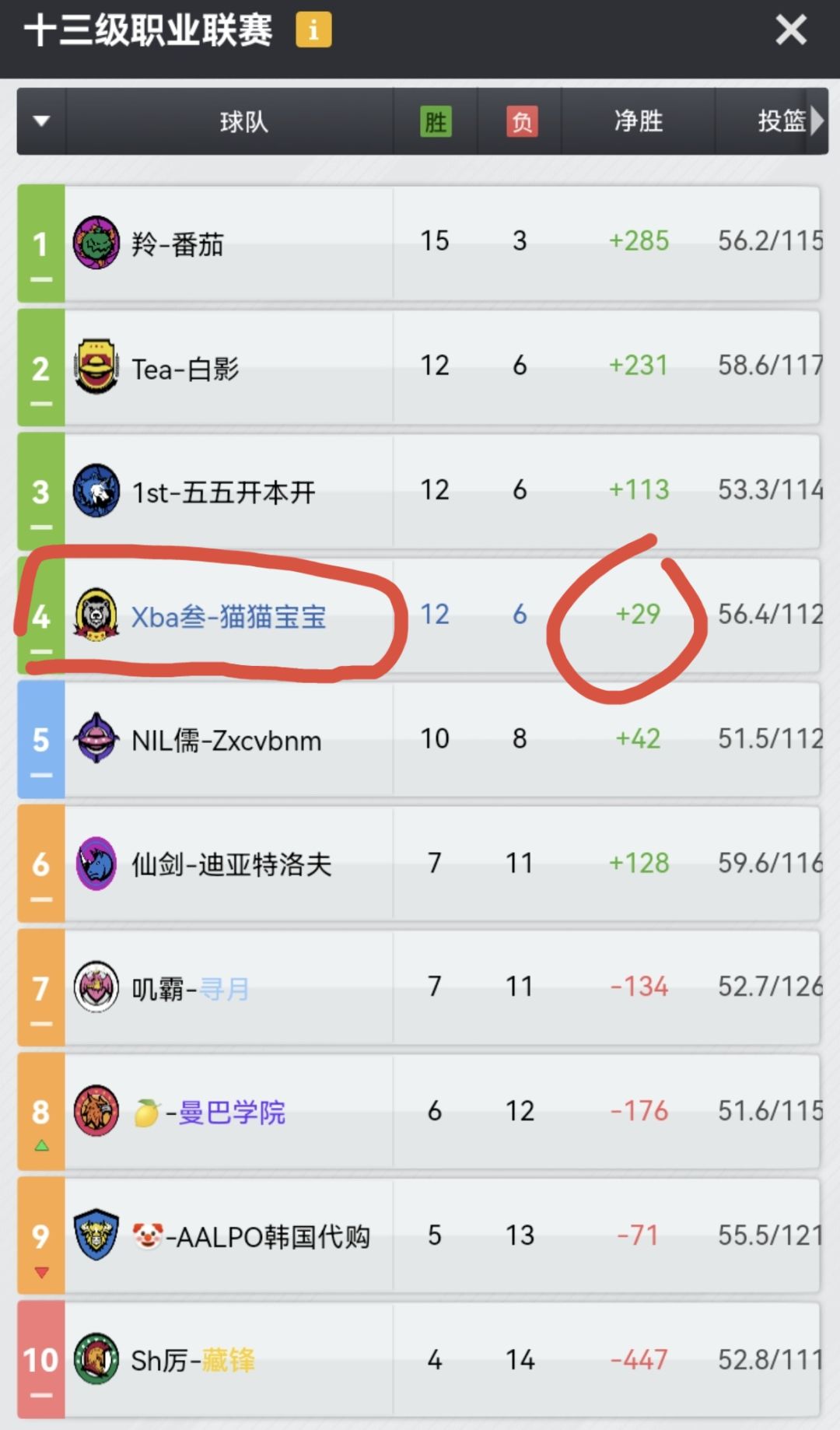 临近三个赛季买了4个年轻中联球员,跌跌撞撞靠征兆从11联到了13联,无青训收入,全靠主队破烂商业,资金周转和训练位置均是捉襟见肘,用最差的游戏条件进行炼狱般、自虐式的运营。本赛季没想到常规赛第四,季后赛又黑四,意料之外又情理之中的晋级14联了。