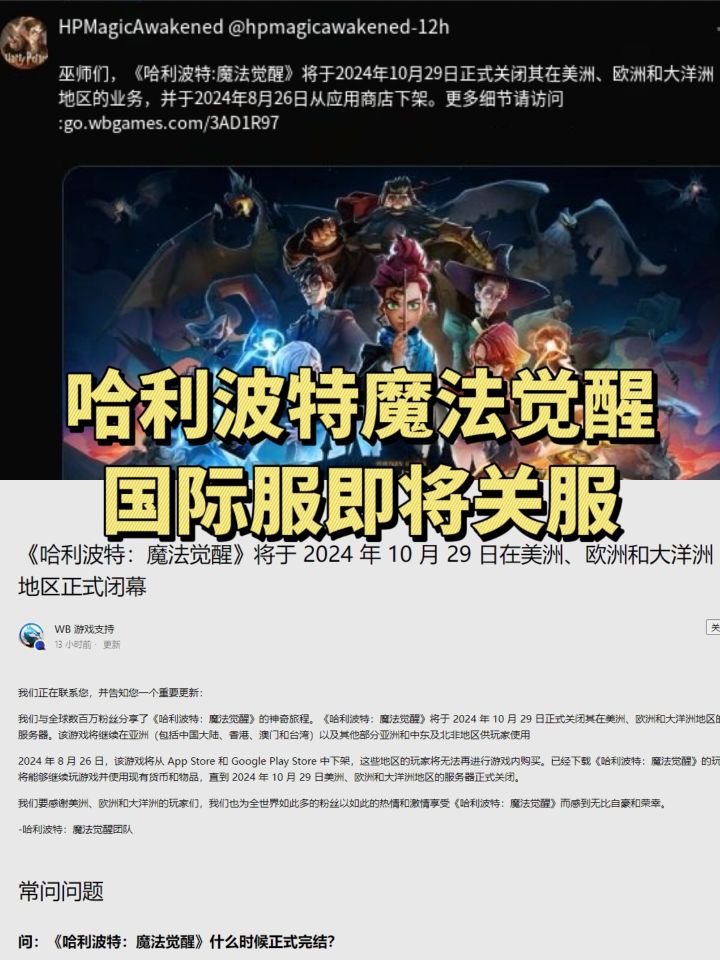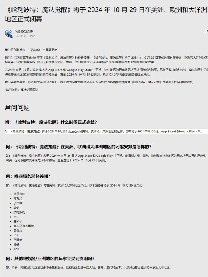 宣布停服的是国际服,涉及到美洲、欧洲和大洋洲地区,目前已从商店下架,停服时间是10月底。