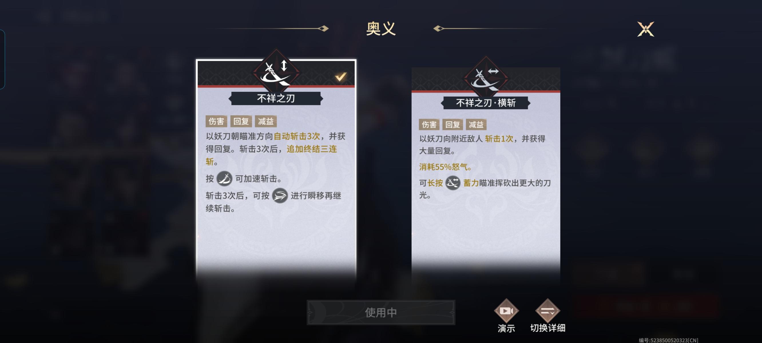 不详之刃是妖刀姬的大招,朝瞄准方向自动斩击三次,威力逐渐提高。每次斩击后都可按左键瞬移并连续斩击,按右键可加速斩击。首次挥刀前免疫抓取等控制效。