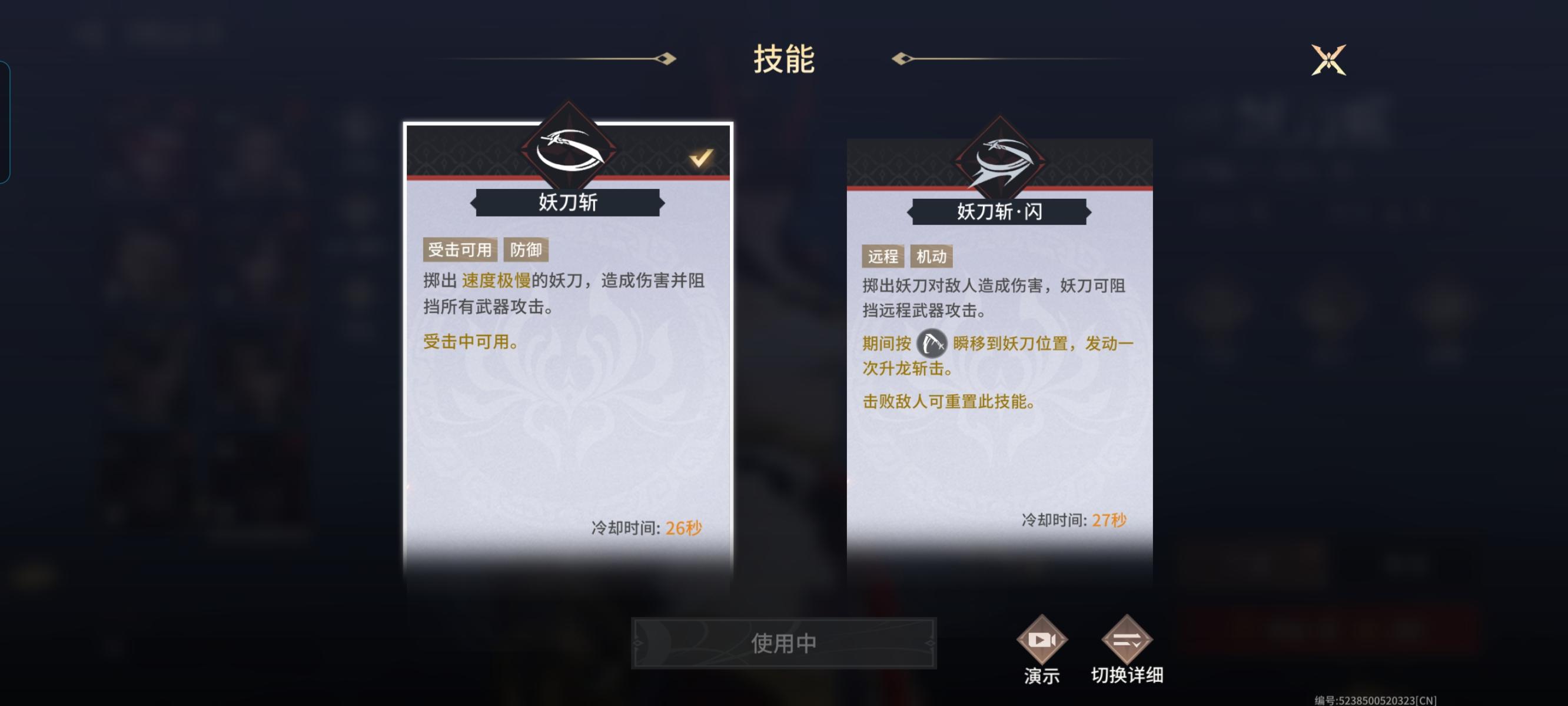 妖刀斩是妖刀姬的基础技能,分为两段。第一段掷出回旋刀,最远推进20米,悬停3.5秒,期间可阻挡远程武器攻击。第二段则允许玩家瞬移到妖刀位置,发动一次升龙斩击,击败敌人可立即重置技能。