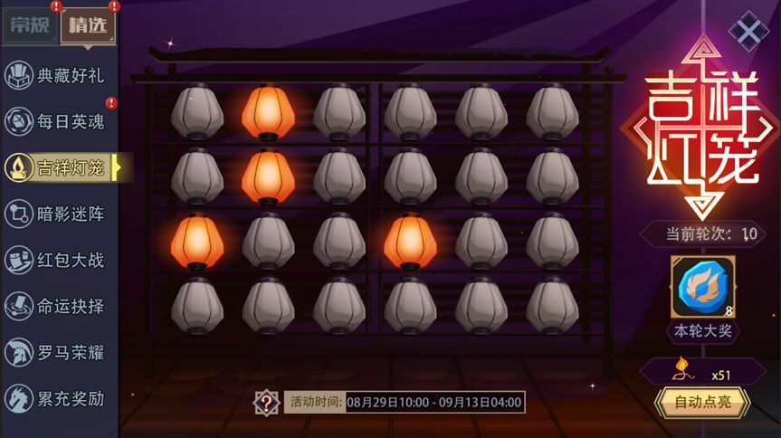 活动内容:活动期间,消耗“如意灯芯”来点亮灯笼,每次能获得“随机奖励”或“本轮大奖”。获得“本轮大奖”后,将重置已点亮的全部灯笼并进入下一轮游戏。每一轮开始时可自选一项大奖,每逢进行10的整数倍轮次时,“本轮大奖”的内容将全面升级。
