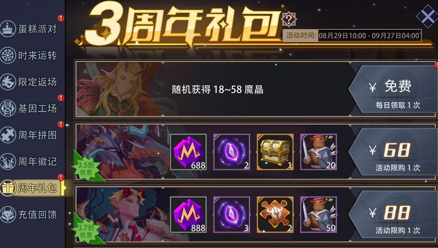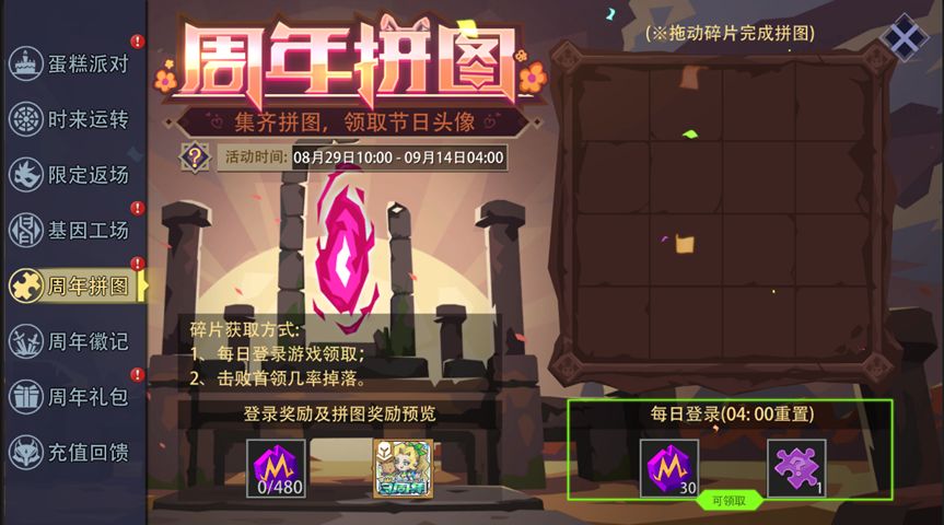 活动内容:活动期间,每日登录游戏可领取魔晶及随机拼图碎片奖励。另外,在(冒险模式/冒险试炼场/梦魇模式)下击败首领也有几率掉落拼图碎片。集齐所有拼图碎片并拼凑完整,还可以获得“头像[恶魔秘境3周年]”。