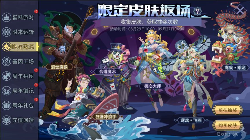 活动内容:活动期间,6款限定皮肤限时返场。每拥有1款指定的限定皮肤,将可额外获得1次抽奖机会,可前往“时来运转”活动进行抽奖。