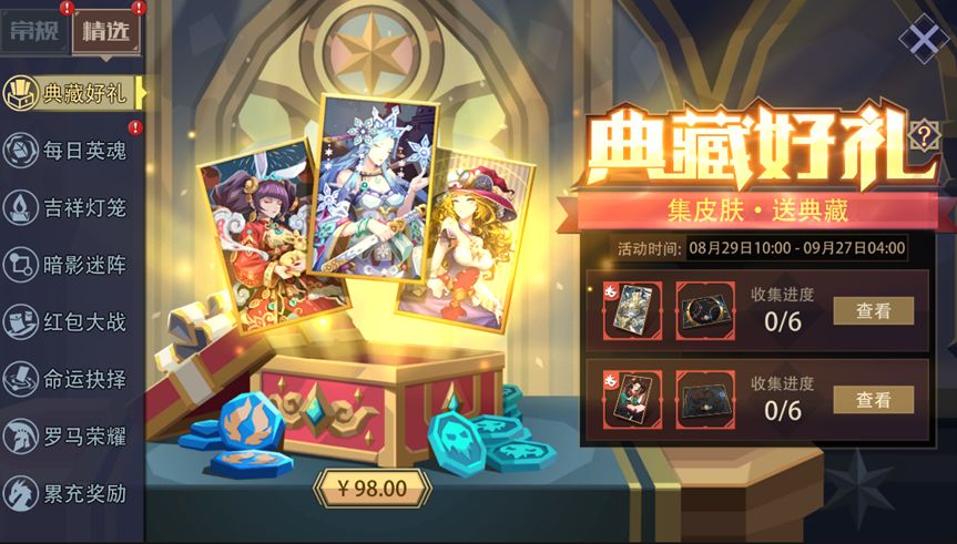 活动内容:活动期间, “精选限定皮肤礼包” 限时开启售卖;礼包内含:“精选限定皮肤自选x1”,“精选限定头像自选x1”、“魂石x20”、“灵魂碎片x10”。每集齐礼包内的指定6款皮肤,即可免费领取对应的“典藏皮肤”和“限定场景”(已经拥有该奖励的玩家不可重复领取)。