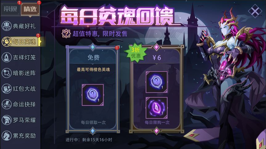 活动内容:活动期间,免费礼包每日可领取一次,可获得“随机英魂”(可开出绿~橙英魂);次日04:00刷新。活动期间,6元礼包每日限购一次,可获得“史诗英魂”和“随机英魂”。
