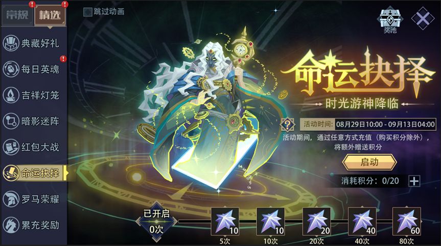 活动内容:活动期间,通过任意方式充值(购买积分除外)将额外赠送“积分”,1元等于“1积分”。每次需要消耗“20积分”来启动游戏,可获得“神系英雄[时光游神]”、“专属皮肤[废墟行者]”、“卡背[时光秘轮]”、“4款[动态头像]”等。