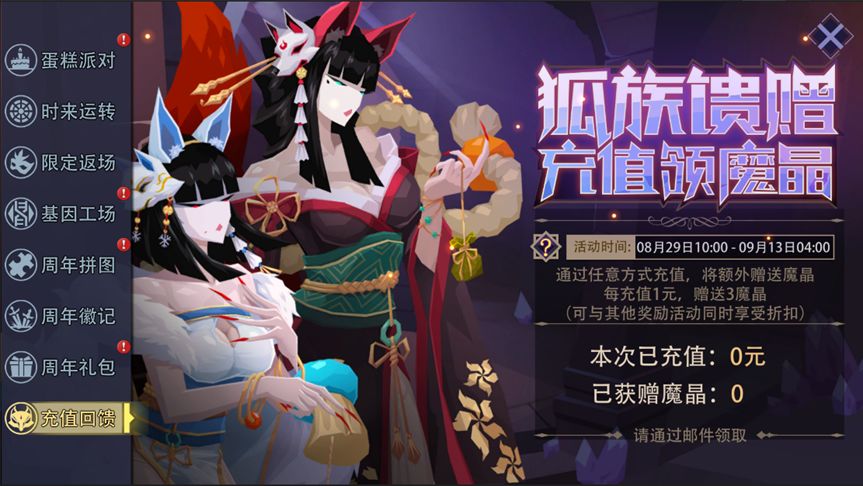 活动内容:狐族姐妹花与你共度狂欢。活动期间,通过任意方式充值任意金额,都会额外赠送魔晶。每充值1元,赠送3魔晶,赠送无上限。充值成功后,赠送的魔晶会立即通过邮件发放,请及时领取奖励。