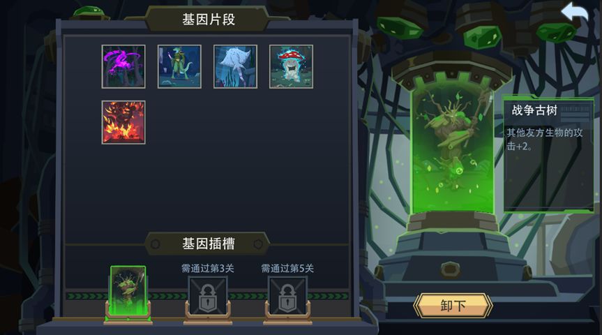 (4)该模式下,你的英雄将拥有3个[基因插槽],分别在通过1/3/5关后解锁。在[基因插槽]中插入[基因片段],英雄可获得该生物卡的所有能力。每场战斗胜利后可随机获得3个生物的[基因片段]。