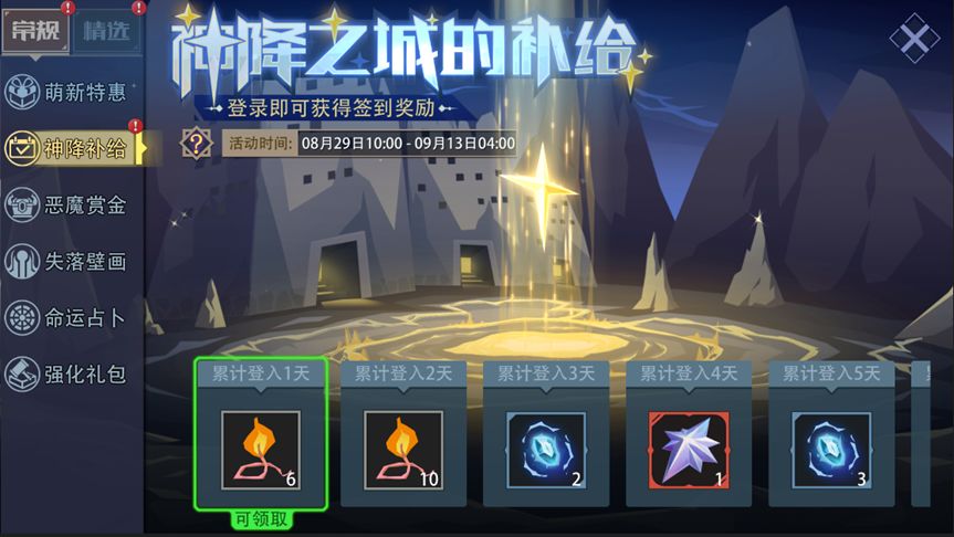 活动内容:受光之女神的庇佑,神降之城物资丰厚。活动期间,每日登录游戏即可领取“如意灯芯”、“神祗碎片”、“王者英魂”等丰厚奖励。