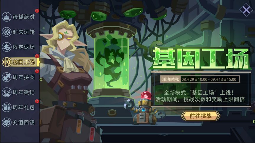 活动内容:全新模式“基因工场”上线。活动期间,挑战次数和奖励上限翻倍。活动结束后恢复默认,请及时参与。