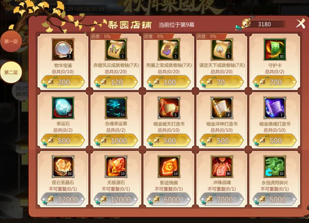 梨园店铺大奖无数,等待仙术师拿桂花铃换取!梨园店铺分为两层,第二层需要进入在月戏奏影进入第8幕后解锁。