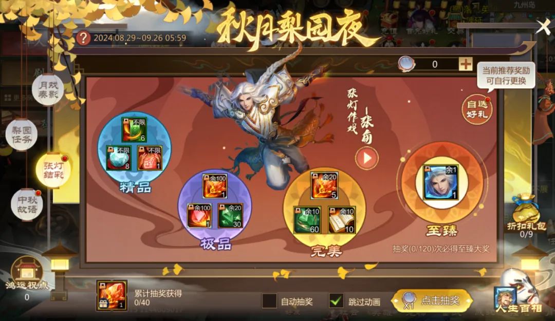 张灯结彩,物华天宝。使用一个物华宝鉴可进行一次张灯结彩抽奖,活动期间仙术师可自选至臻、完美、极品和精品宝物加入奖池,自选奖励可随时更换。单类物品存在抽取上限,余数为0时无法加入奖池。累计抽奖达120抽必得至臻大奖,获得至臻大奖后将重置该累计次数。