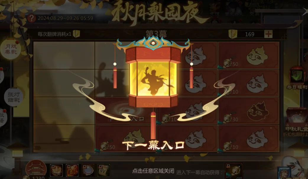 活动期间使用影灯,可在月戏奏影中点击影窗翻牌,每次翻牌消耗1影灯。