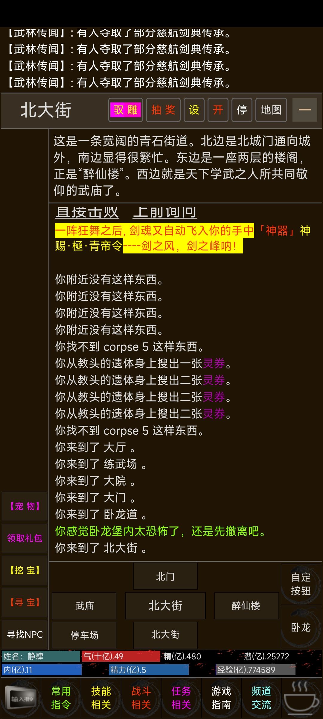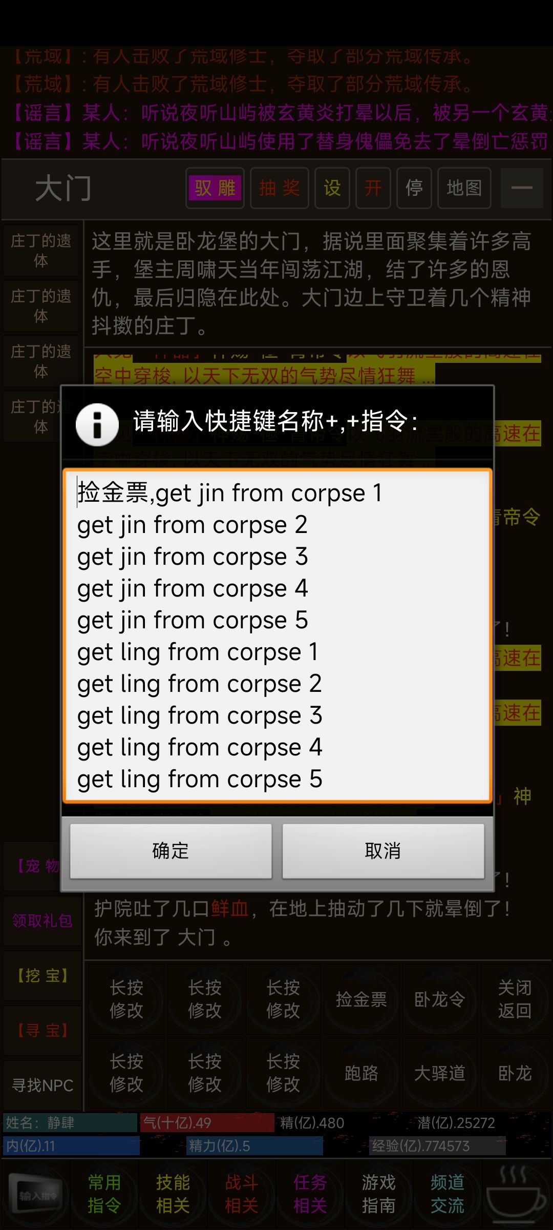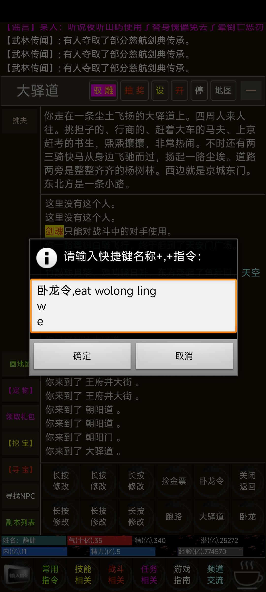 (武学技能群攻有武道三千,及独孤九剑的剑魂这里我用的剑魂)点击会飞去广场,到了广场就用自定义按钮跑至卧龙副本处也就是用图三指令