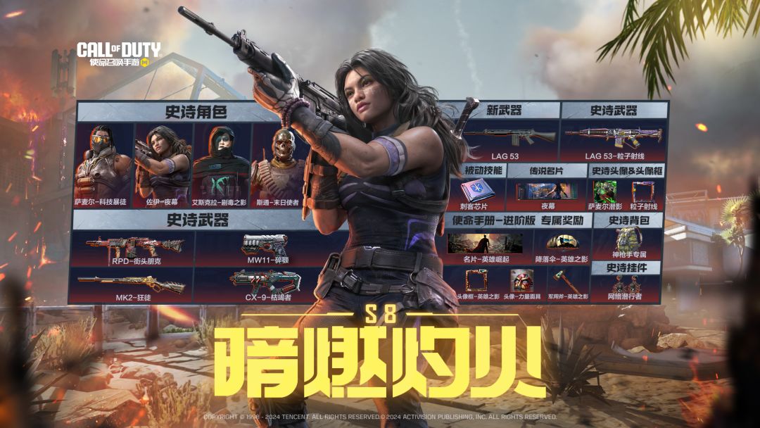 在S8使命手册“暗燃灼火”中,还有名片-夜幕、头像框-粒子射线、头像-萨麦尔潜影、挂饰-网络潜行者、背包-神枪手专属等极具特色的精美奖励等待战士们获取。