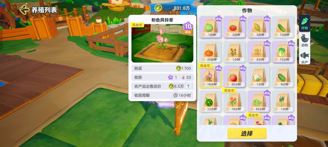 1-10级阶段每轮蔬菜种不了几轮就会升级解锁性价比更高的菜,因此不用追求把蔬菜的熟练度种到满级。10-20级时,可以白菜(Lv10)和草莓(Lv12)搭配着种,后期再中几轮生菜(Lv18,32h),就能稳定过渡到20级。到达15-20级区间后,萌新星宝们也需要为20级以后解锁牧场攒攒金币啦!牧场解锁后如果想要一口气达到最大收益,可是需要将动物小铺的等级从1级提升至20级才能获到最高的售价加成,这里需要的金币大约是90w,在16级解锁黄色郁金香后种上几轮,就能在20级后领先一大步啦!