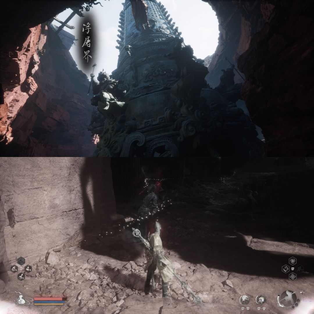 但在这一短板上,《黑神话:悟空》也依然带来了一些惊喜,在第三回小西天的地图里,制作组就以结构层次足够立体、分层探索足够有趣的浮屠塔地图给我留下了深刻的印象。诚然,这张地图的整体反馈并不佳,但就地图结构本身而言,确实是值得夸赞的。