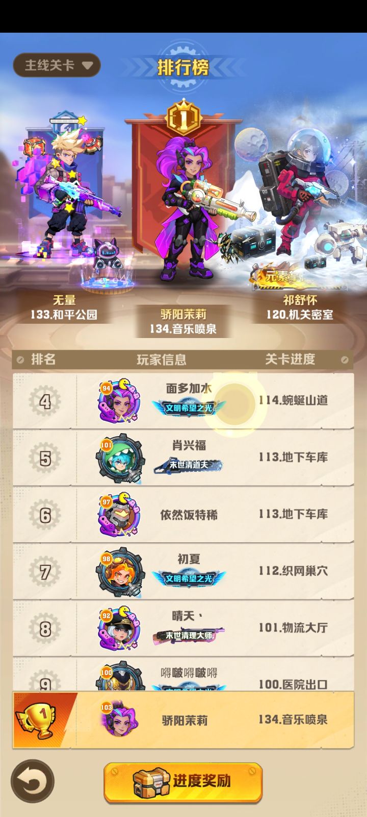 134关我有火核车核,绝世超时空(太猛了,没绝世的小伙伴一定把每天的所有佣兵券都换了),用冰暴控精英,子弹分裂清场就可以。