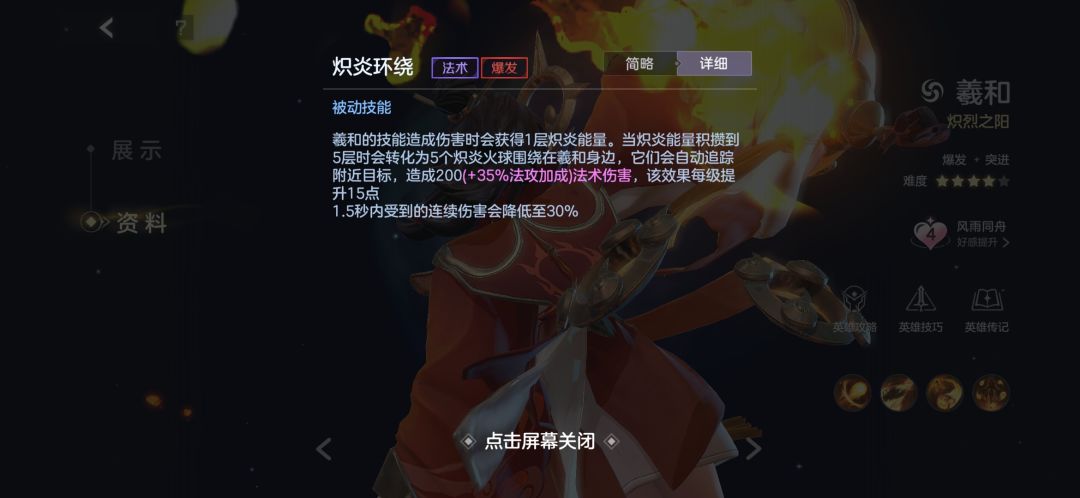 羲和的技能在命中单位后会积攒一层被动,达到五层时会在周身生成五团火焰自动攻击周边敌人(优先攻击敌方英雄)。需要注意的是1.5秒内被动对同一目标的伤害会降低。被动是羲和消耗和伤害的重要来源之一,对局中多注意被动的积攒。携带满层被动打伤害的羲和拥有更强的伤害能力。被动层数积攒没有冷却时间但是被动有持续时间,当你拥有满层被动时技能命中多个单位时仍可以快速积攒被动。利用这一特性一定程度上可以再次快速激活被动的火球,来制造更多的伤害。