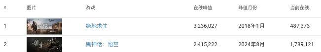 和大家所期待的一样,游戏再次刷新了自己在Steam平台的同时在线人数峰值,达到了241.5万人次。至此,《黑神话:悟空》与Steam全球同时在线人数峰值排名第一的《绝地求生》只有约80万的距离。
