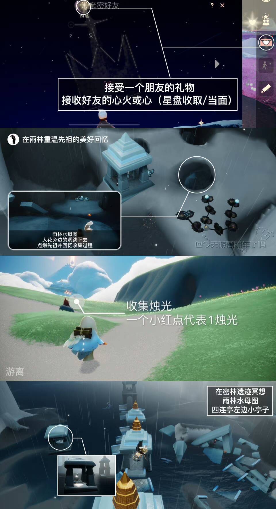 《光遇》游戏中每天的每日任务及大蜡烛的位置都不相同,玩家完成每日任务及收集大蜡烛都可以得到丰厚的兑换奖励,奖励可以用于兑换各种动作及道具,不过很多小伙伴不知道每日任务怎么做,又懒得自己去找大蜡烛的位置,我们汇总了每日任务的完成攻略以及蜡烛位置,一起来看看吧!
