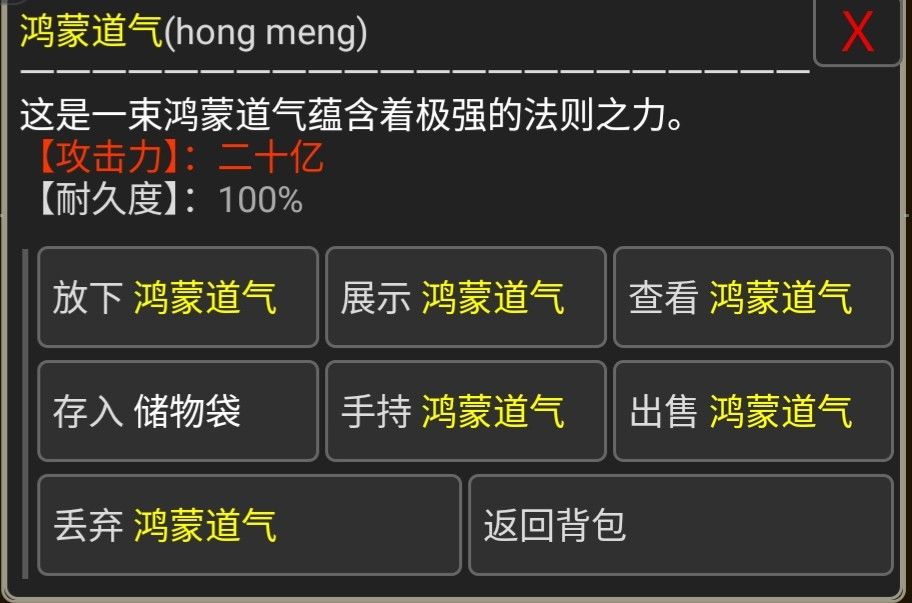 ②吃一气鸿蒙丹(可获得一把暂时使用的鸿蒙道气,拥有二十亿攻击力)