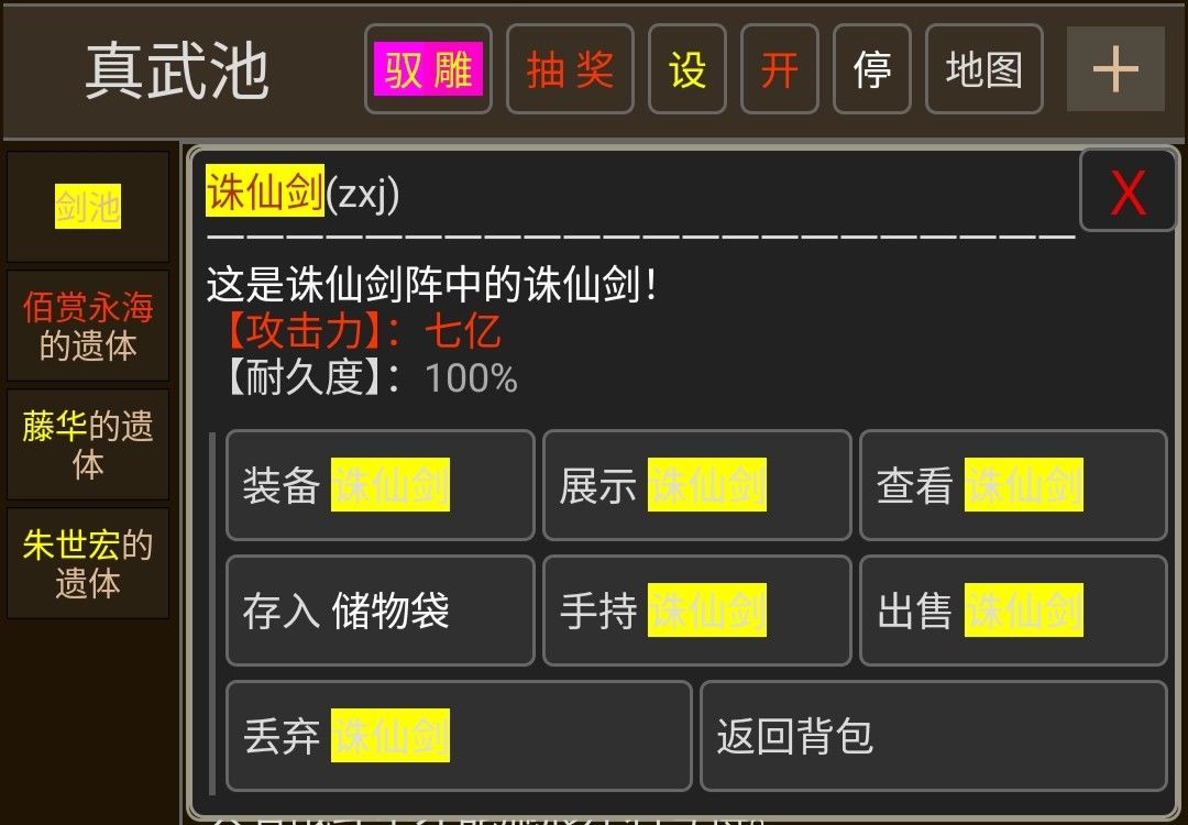 ①驭雕龙虎山(不要打小怪,会被控死,不小心打了就退后台重上)----找到真武池----指令 qujian----多试几次就能取到一把几亿攻击力的绝世神兵(下线会消失)